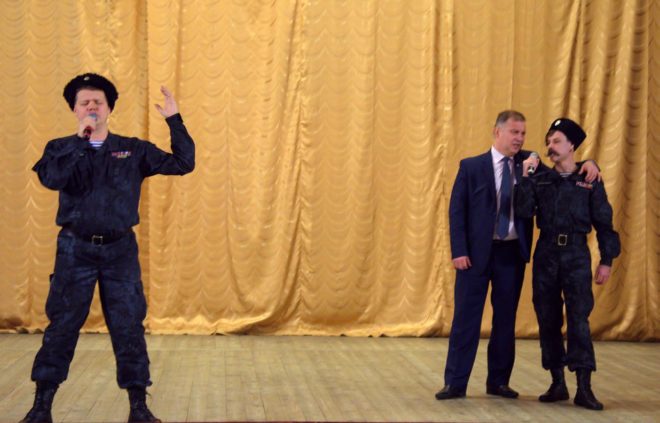 Ансамбль «Братья казаки» – постоянные участники гуманитарных миссий, лауреаты премии «ОФИЦЕРЫ РОССИИ» – в составе художественного руководителя Андрея Толстякова и Григория Вильдермана подготовили для присутствующих концертную программу. Зал тепло встретил коллектив. По традиции Вячеслав Коценко исполнил песню «Журавли» вместе с ансамблем в знак памяти павшим героям.